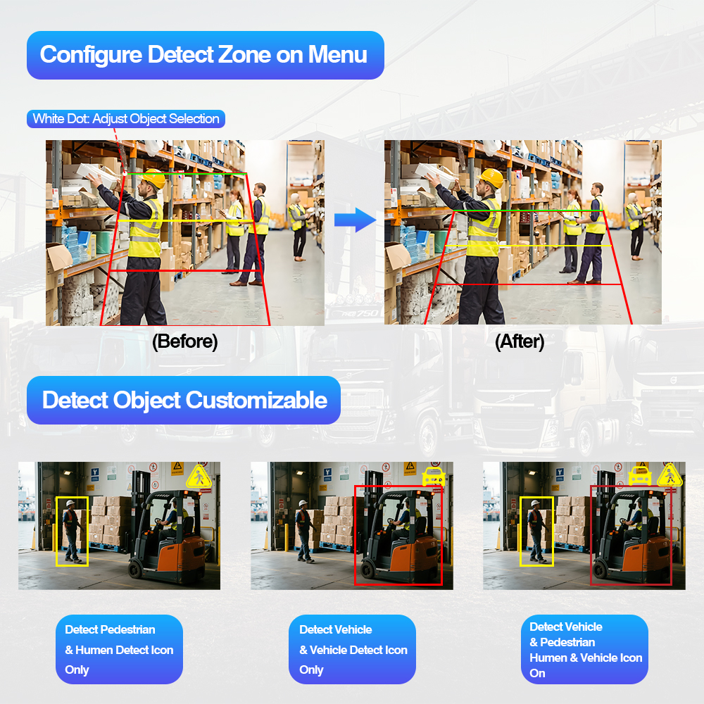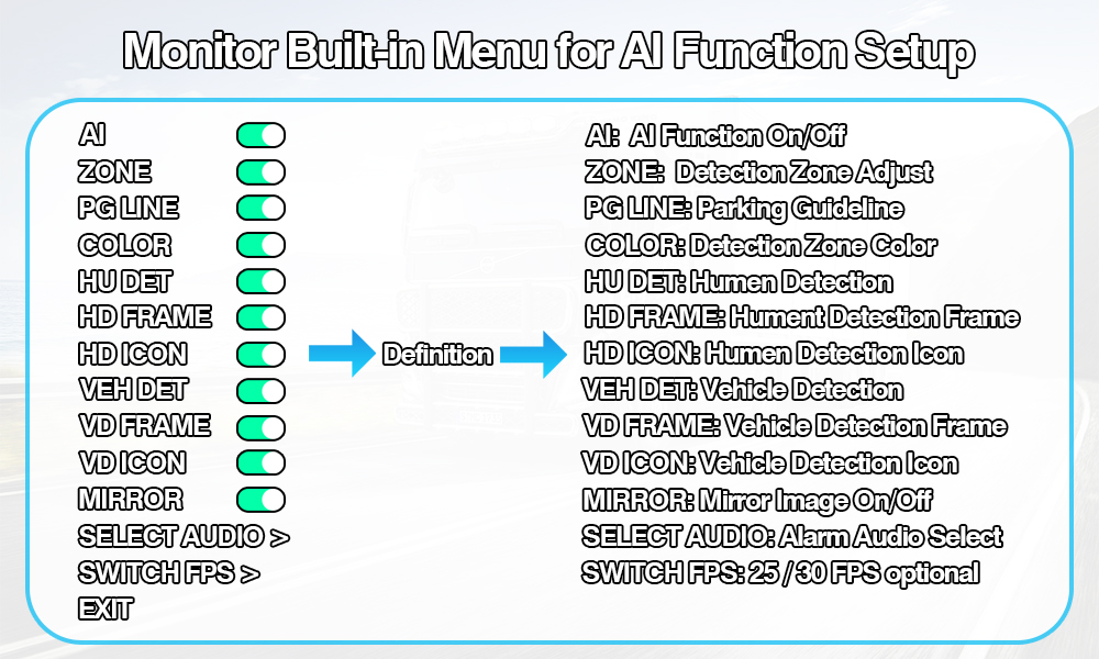 एआय ब्लाइंड स्पॉट डिटेक्शन रिअर व्ह्यू कॅमेरा अंगभूत रंग बदलणारा चेतावणी प्रकाशएआय ब्लाइंड स्पॉट डिटेक्शन कॅमेरा सिस्टम बिल्ट-इन कलर चेंजिंग वॉर्निंग लाइट हा एक बुद्धिमान वाहन सुरक्षा संच आहे ज्यामध्ये AI BSD कॅमेरा आणि AI मॉनिटरचा समावेश आहे जो AI कॅलिब्रेशन सेटिंगला सपोर्ट करतो, वापरकर्त्याला AI सेटिंग बदलण्याची परवानगी देतो, जसे की डिटेक्शन एरिया साइज ऍडजस्टमेंट, ऑडिओ अलार्म प्रकार निवडण्यायोग्य, पादचारी डिटेक्शन चालू/बंद, वाहन शोधणे चालू/बंद करणे आणि इतर कोणतीही सेटिंग चालू/बंद करणे.