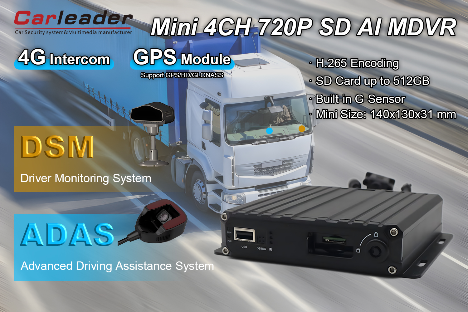 कारलीडर 4CH AI इंटेलिजेंट मोबाइल DVR सह DSM आणि ADAS कॅमेरा आयडियल व्यावसायिक फ्लीट्स, सार्वजनिक वाहतूक, कायद्याची अंमलबजावणी करणारी वाहने, वैयक्तिक आणि व्यावसायिक वाहन सुरक्षा प्रणालींमध्ये वापरण्यासाठी