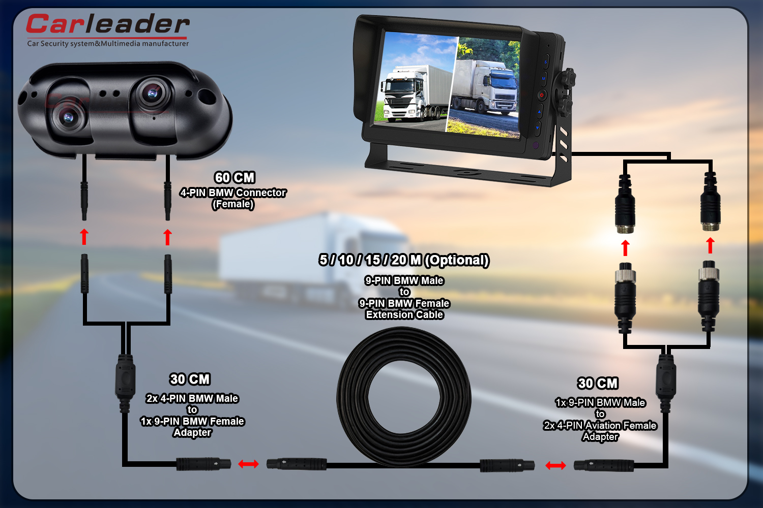 पहिला उपाय कॅमेरा आणि मॉनिटर कनेक्ट करण्यासाठी फक्त एक एक्स्टेंशन केबल (9-पिन BMW कनेक्टर), 1 ते 2 स्प्लिट केबल वापरतो. कारण हे समाधान केवळ विस्तार केबलवरच आहे, जे वायरिंग प्रक्रिया सुलभ आणि अधिक सोयीस्कर बनवते.