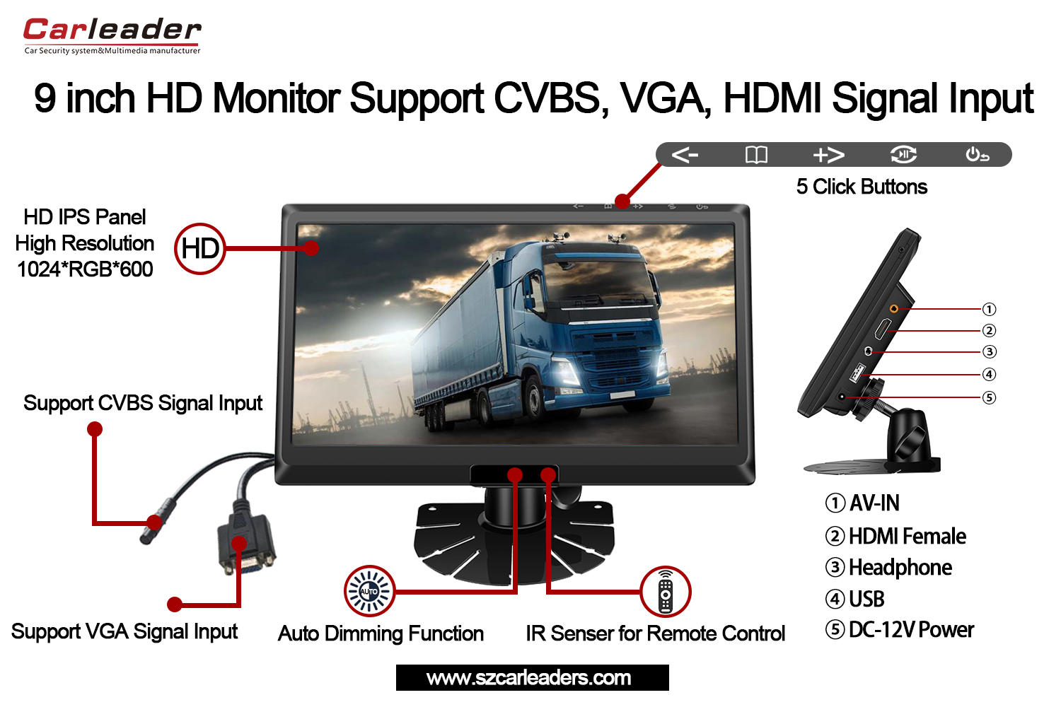 आमचेकारलीडर 9 इंच IPS स्क्रीन HD मॉनिटर सपोर्ट CVBS+HD+VGA इनपुटआमच्या सर्व वाहन मॉनिटर्समध्ये सर्वोत्तम व्हिडिओ गुणवत्ता आणि स्पष्टता आहे,आणि मॉनिटरच्या शीर्षस्थानी 5 विशेष क्लिक बटणे आहेत, 9 इंच IPS स्क्रीन कार मॉनिटर सपोर्ट CVBS,HD,VGA सध्या स्टॉकमध्ये आणि विक्रीवर आहे.