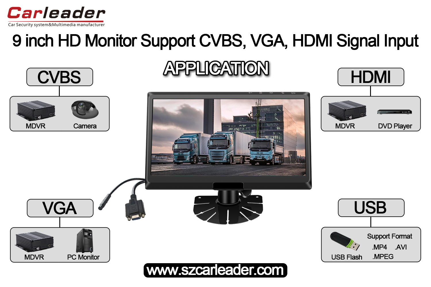 कारलेडर9 इंच IPS स्क्रीन HD मॉनिटर सपोर्ट CVBS+HD+VGA इनपुटवाहन निरीक्षण आणि MDVR फ्लीट व्यवस्थापनासाठी डिझाइन केलेले उच्च कार्यक्षम HD मॉनिटर आहे. कार मॉनिटर CVBS, HD आणि VGA सिग्नल इनपुटला सपोर्ट करतो. आणि MDVR मध्ये VGA किंवा HD इंटरफेस असल्यास, 9 इंच IPS स्क्रीन कार मॉनिटरसह वापरता येईल.