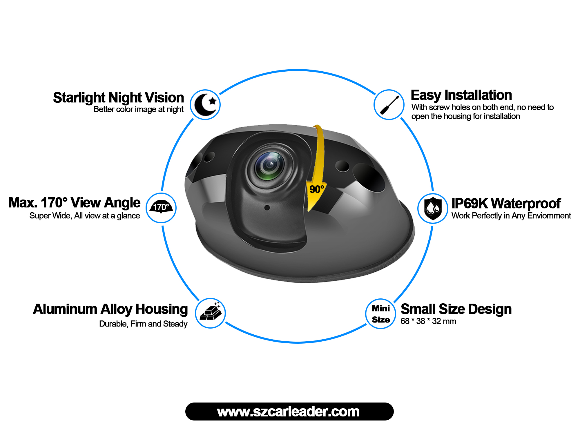 AHD 170 डिग्री वाइड व्ह्यू अँगल वॉटरप्रूफ हेवी ड्यूटी बॅकअप कॅमेरा ड्रायव्हिंग प्रक्रियेदरम्यान ड्रायव्हरला स्पष्ट रिअल-टाइम चित्र प्रदान करतो. त्याचा अति-मोठा कोन 170° पर्यंत आहे, ड्रायव्हरला मॉनिटरिंग रेंजची विस्तृत श्रेणी प्रदान करण्यासाठी अधिक आहे, जेणेकरून ड्रायव्हर वाहनाच्या सभोवतालच्या वातावरणावर कोणत्याही आंधळ्या डागांशिवाय लक्ष ठेवू शकेल.