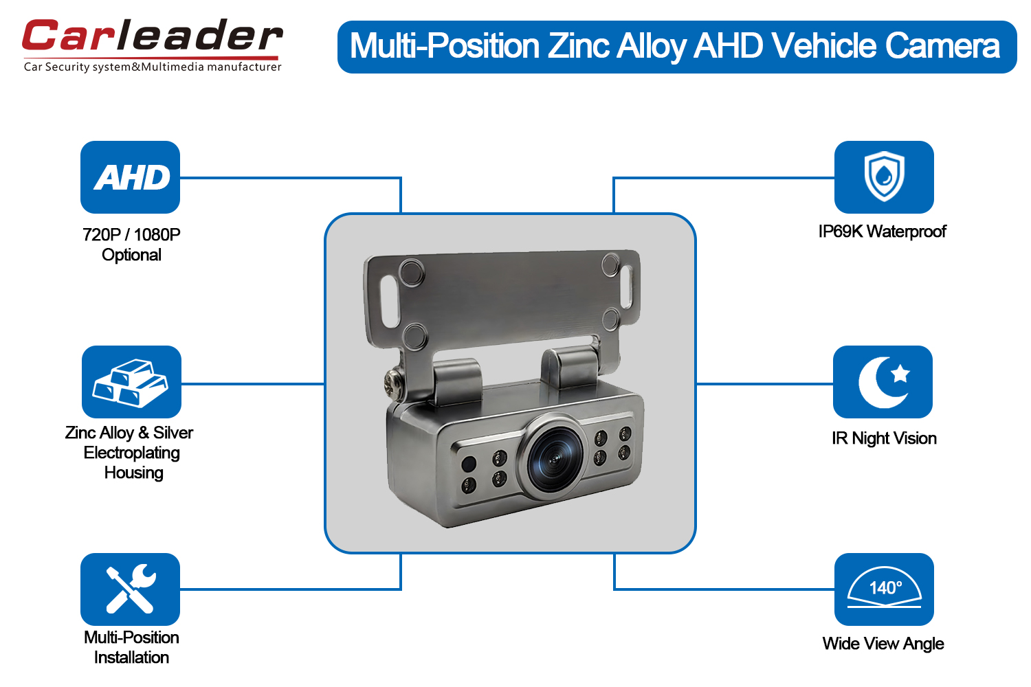 कारलेडरAHD सिल्व्हर इलेक्ट्रोप्लेटिंग व्हेईकल रिव्हर्सिंग कॅमेरा, झिंक मिश्र धातु गृहनिर्माण आणि सिल्व्हर इलेक्ट्रोप्लेटिंगसह, १४० डिग्री वाइड व्ह्यूइंग अँगल आणि IP69K वॉटरप्रूफ आणि डस्टप्रूफ. प्रतिष्ठापन कोन आणि स्थान देखील screws द्वारे निश्चित केले जाऊ शकते.