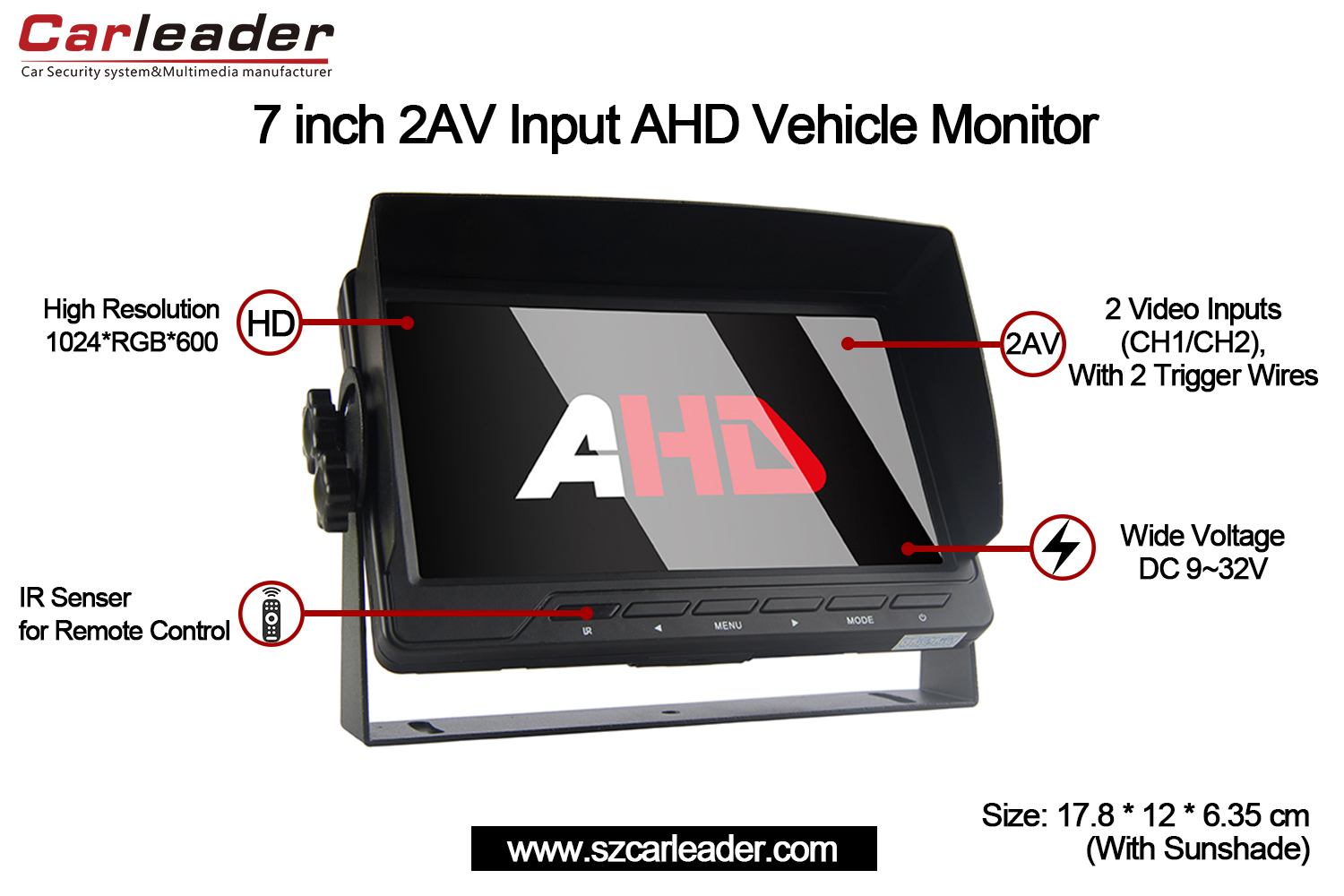 कारलीडर 7 इंच AHD 2CH इनपुट वाहन मॉनिटरकॉम्पॅक्ट आणि टिकाऊ डिझाईनमध्ये विश्वासार्हता, स्पष्टता आणि अष्टपैलुत्व यांची सांगड घालते, ज्यामुळे ते व्यावसायिक आणि वैयक्तिक वाहन निरीक्षण गरजांसाठी एक उत्कृष्ट पर्याय बनते.