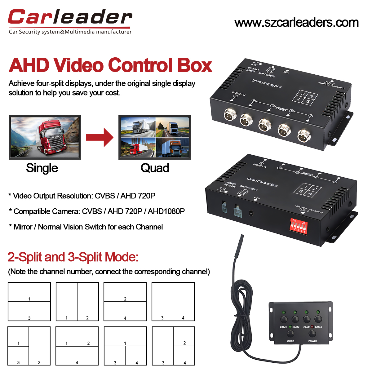 Carleader बद्दल आपल्याला काय माहित असणे आवश्यक आहे याबद्दल बोलूयाएएचडी क्वाड व्ह्यू स्प्लिट बॉक्स व्हिडिओ प्रोसेसरअवजड वाहनांसाठी. एएचडी क्वाड स्प्लिट कंट्रोल बॉक्स हे वाहन सीसीटीव्ही मॉनिटरिंग सिस्टीमसाठी महत्त्वाचे उपकरण आहे. बस ट्रक व्हिडिओ स्प्लिट कंट्रोल बॉक्स एका मॉनिटरला क्वाड व्ह्यू मॉनिटरमध्ये बदलण्यास समर्थन देतो आणि 4 AHD कार कॅमेऱ्यांशी कनेक्ट होऊ शकतो. खालील AHD रीअरव्ह्यू कॅमेरा व्हिडिओ कंट्रोल बॉक्स कार्ये, वैशिष्ट्ये आणि विशिष्ट वापर प्रकरणांचे तपशीलवार स्पष्टीकरण आहे.