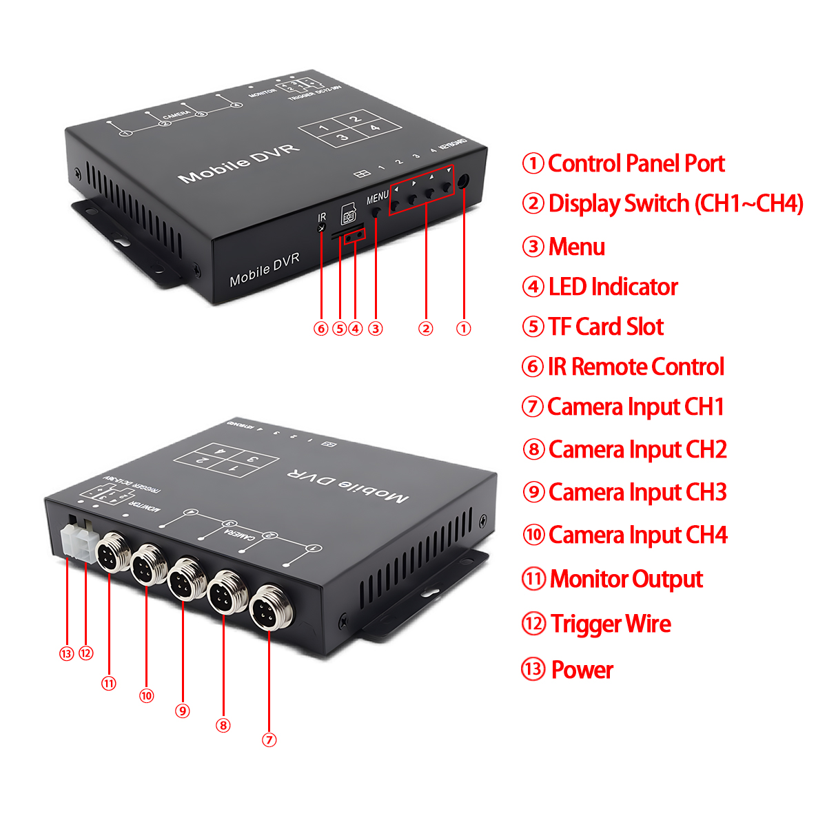 कारलीडर क्वाड व्हिडिओ स्प्लिटर बॉक्स 4CH व्हिडिओ स्प्लिटर बॉक्सची सोय DVR रेकॉर्डिंग फंक्शनच्या सुरक्षिततेसह एकत्र करते. स्वतंत्र इमेज सेटिंग, लवचिक ट्रिगर मोड (ट्रिगर वायर आणि रिमोट कंट्रोल), स्क्रीन एज ॲडजस्टमेंट, वाइड व्होल्टेज इनपुट आणि मजबूत संरक्षण यासह त्याचे सर्वसमावेशक वैशिष्ट्य सेट - मागणी असलेल्या मोबाइल वातावरणासाठी तयार केलेले एक विश्वासार्ह आणि उच्च-गुणवत्तेचे पाळत ठेवणारे समाधान प्रदान करते. Carleader 1080P AHD क्वाड स्प्लिट डिस्प्ले व्हिडिओ प्रोसेसर सपोर्ट व्हिडिओ रेकॉर्डिंगसह संपूर्ण परिस्थितीजन्य जागरूकता आणि सुरक्षित व्हिडिओ पुरावा सुनिश्चित करा..