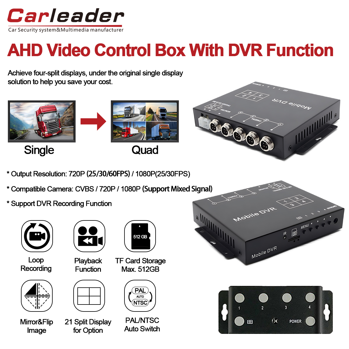 सह वाहन पाळत ठेवणे प्रणाली उन्नत कराCarleader 1080P AHD क्वाड स्प्लिट डिस्प्ले व्हिडिओ प्रोसेसर सपोर्ट व्हिडिओ रेकॉर्डिंग, एक अष्टपैलू 4CH व्हिडिओ स्प्लिटर बॉक्स प्रगत DVR रेकॉर्डिंग क्षमतेसह एकत्रित केले आहे. विश्वासार्ह, लवचिक आणि हाय-डेफिनिशन मॉनिटरिंगसाठी डिझाइन केलेले, हे कॉम्पॅक्ट युनिट फ्लीट व्यवस्थापन, सुरक्षा वाहने किंवा मल्टी-कॅमेरा इनपुट रेकॉर्डिंग आणि डिस्प्ले सिस्टम आवश्यक असलेल्या कोणत्याही अनुप्रयोगासाठी आदर्श आहे.