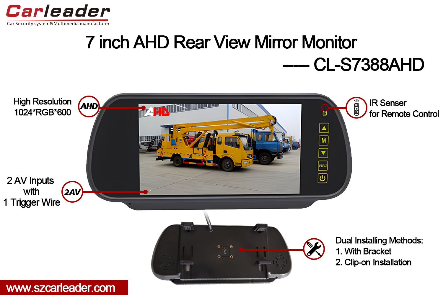 कारलेडर7 इंच TFT LCD रियर व्ह्यू मिरर AHD मॉनिटरआधुनिक वाहन निरीक्षण प्रणालीसाठी अपवादात्मक स्पष्टता आणि अष्टपैलुत्व प्रदान करण्यासाठी डिझाइन केलेले उच्च-कार्यक्षमता 7-इंच कार मिरर AHD मॉनिटर आहे. वापरकर्ता-अनुकूल डिझाइनसह प्रगत वैशिष्ट्ये एकत्रित करून, हा मॉनिटर विविध ड्रायव्हिंग परिस्थितीत विश्वसनीय कार्यप्रदर्शन सुनिश्चित करतो.