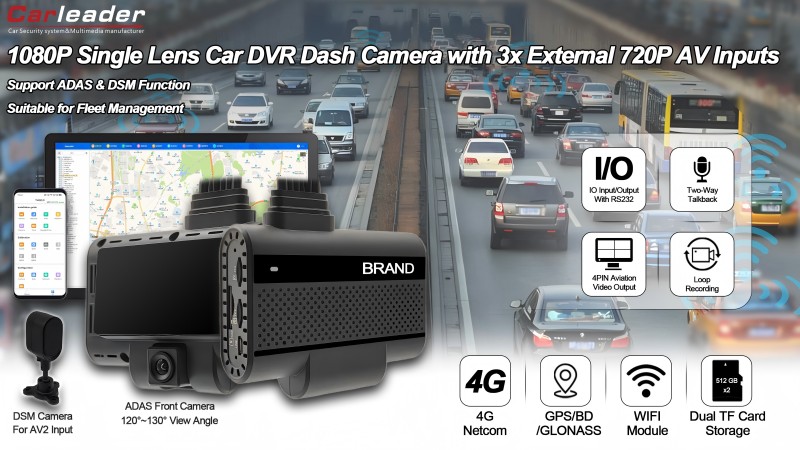 कारलेडर4CH AI पॉवर्ड ADAS+DSM डॅश कॅमेरा सपोर्ट व्हिडिओ आउटपुट यासाठी आदर्श: व्यावसायिक फ्लीट्स, लॉजिस्टिक वाहने, सार्वजनिक वाहतूक आणि वर्धित सुरक्षा, रिअल-टाइम मॉनिटरिंग आणि विश्वसनीय घटना रेकॉर्डिंग शोधणारी वैयक्तिक वाहने.